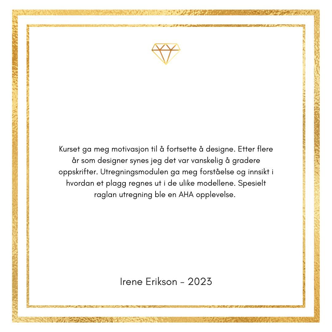 Automatisert utregningssystem som gjør utregningsprosessen enklere og raskere. Et design kan ta mellom 3 - 10 min å regne ut. Systemet er programert med kroppsmål for 4 fasonger (timeglass, rett, pære og eple) 4 ulike profiler: Ekstra tettsittende, tettsittende, normal og oversized. Du fører inn alle bestemmelsene for designer. Systemet regner ut resten. Du lærer også hvordan du overstyrer systemet - fordi: Du som designer tar avgjørelser og derfor bør ikke alt være automatisert. Hver utregning har egne videoer og forklaringer. Tallene for designet ditt er programmert slik at det er enkelt for deg å få tall og tekst rett inn i oppskriften din.
